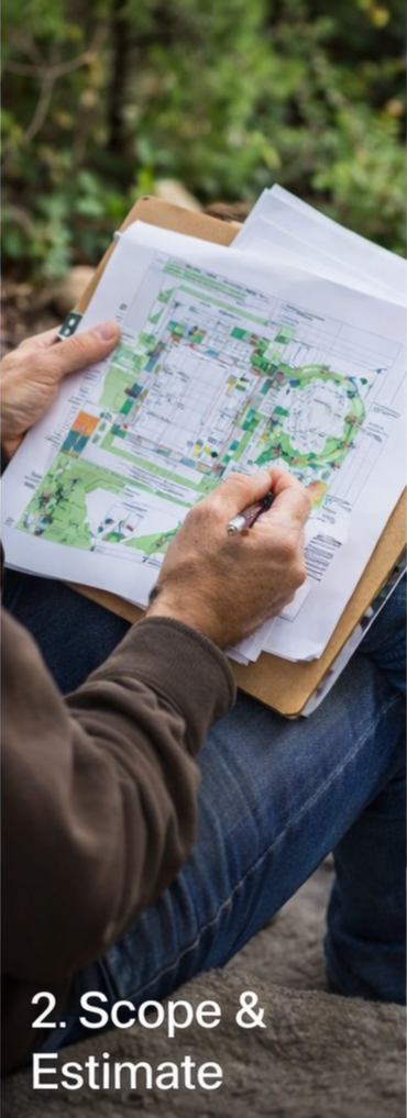 Once we understand the project, we develop a clear scope of work and estimate. Depending on the project, this may include recommendations for landscape construction, irrigation, planting, site preparation, or phased improvements over time.